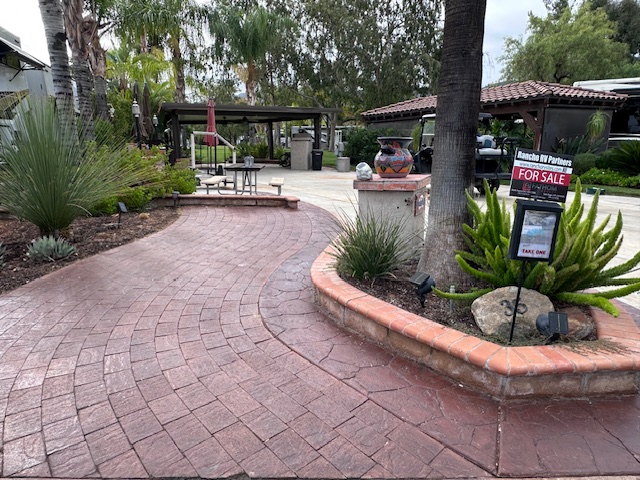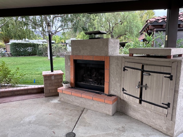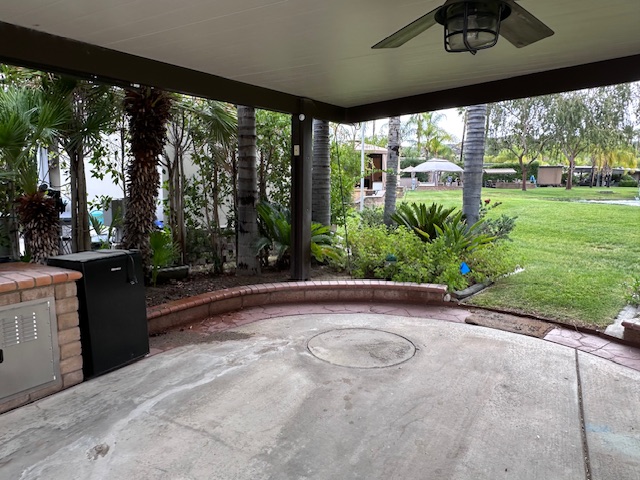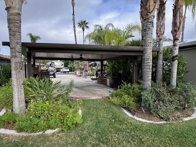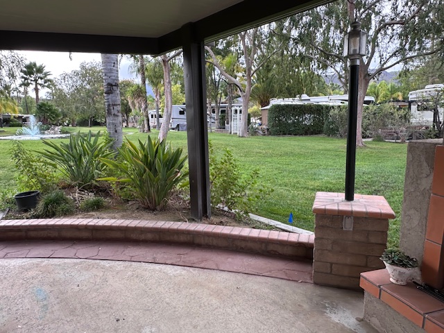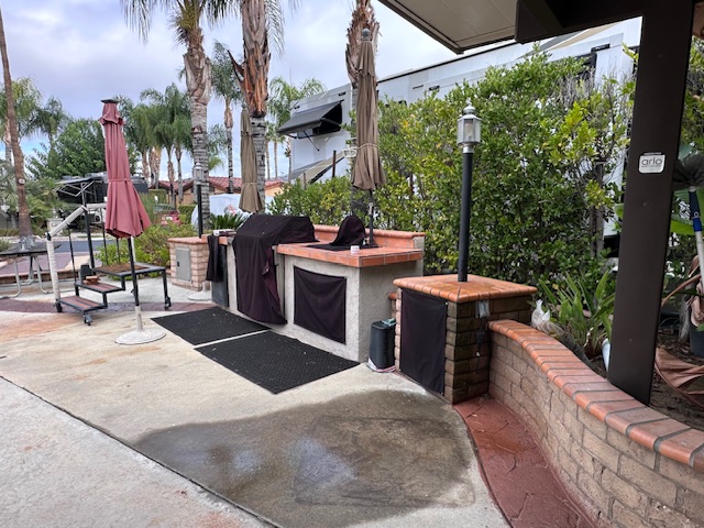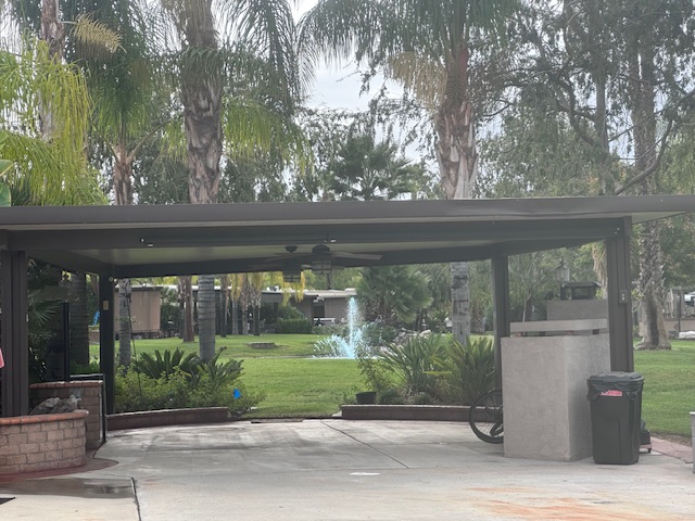 Enjoy peace and privacy on this quiet street with a beautiful water fountain view. This spacious lot features a large Alumawood-covered outdoor living area complete with a cozy fireplace, mounted TV, and ceiling fan to keep you cool. The outdoor kitchen includes a built-in grill, sink, and undercounter refrigerator—perfect for entertaining. With plenty of room to relax or host guests, this site offers the ideal blend of comfort and outdoor enjoyment.